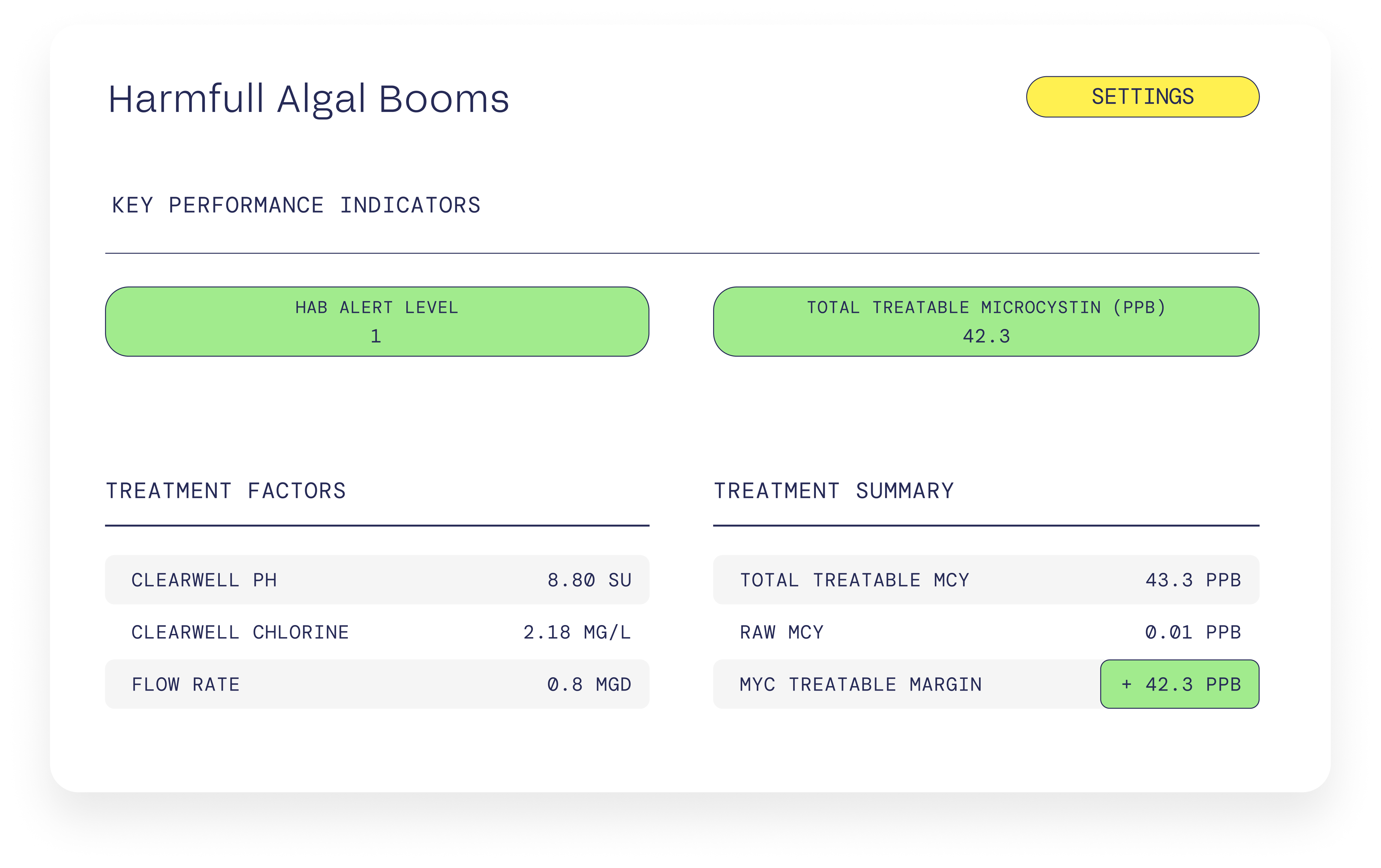 Decision Blue empowers water utility staff to monitor harmful algal bloom (HAB) impacts and risks to treatment operations. The source water HAB risk level is actively monitored, as well as calculating the treatability of microcystin, a common cyanotoxin. This allows staff to optimize treatment strategies and safeguard water quality for consumers, especially in states with stringent cyanotoxin regulations.